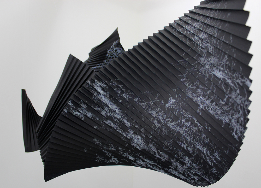The shapes of the paper forms are formed in direct response to Hodogram visualisations of captured sonic recordings of subterranean Cheshire. Subsidence from former mining and current flowing brine rivers are recorded and plotted over 4 dimensions creating beautiful digital maps of unheard sonic traces in space and time.