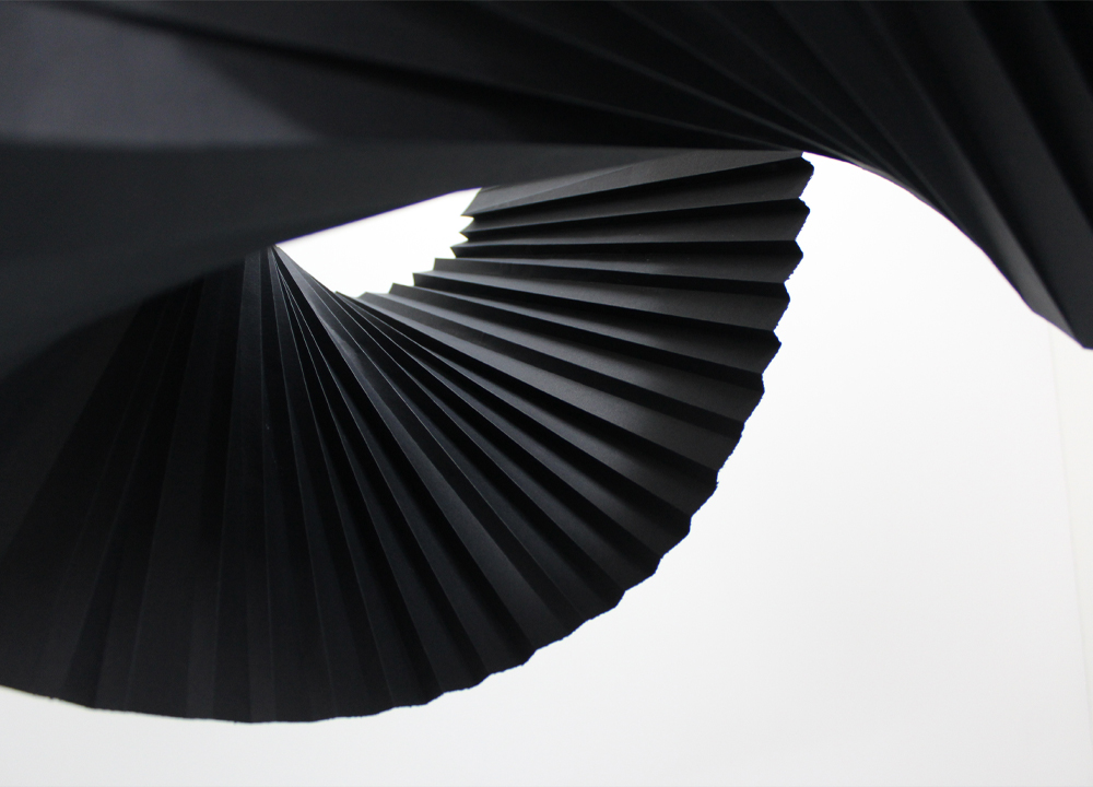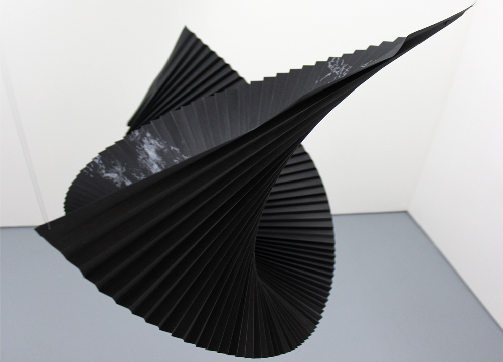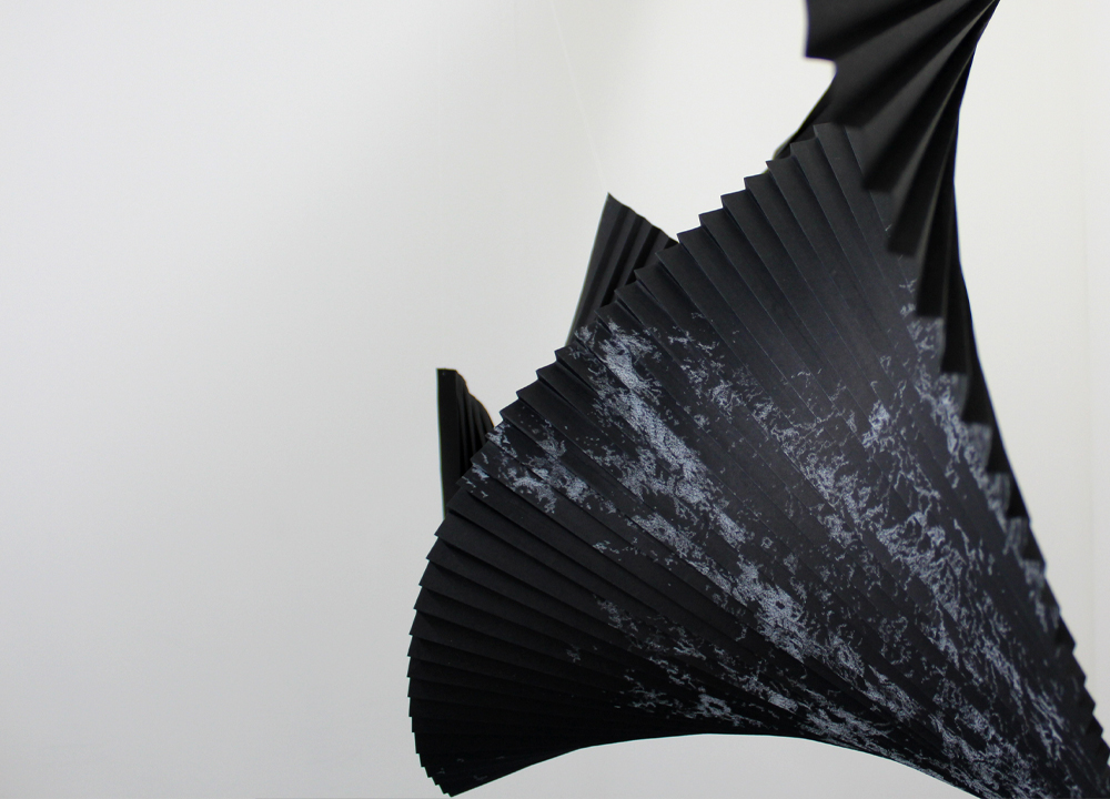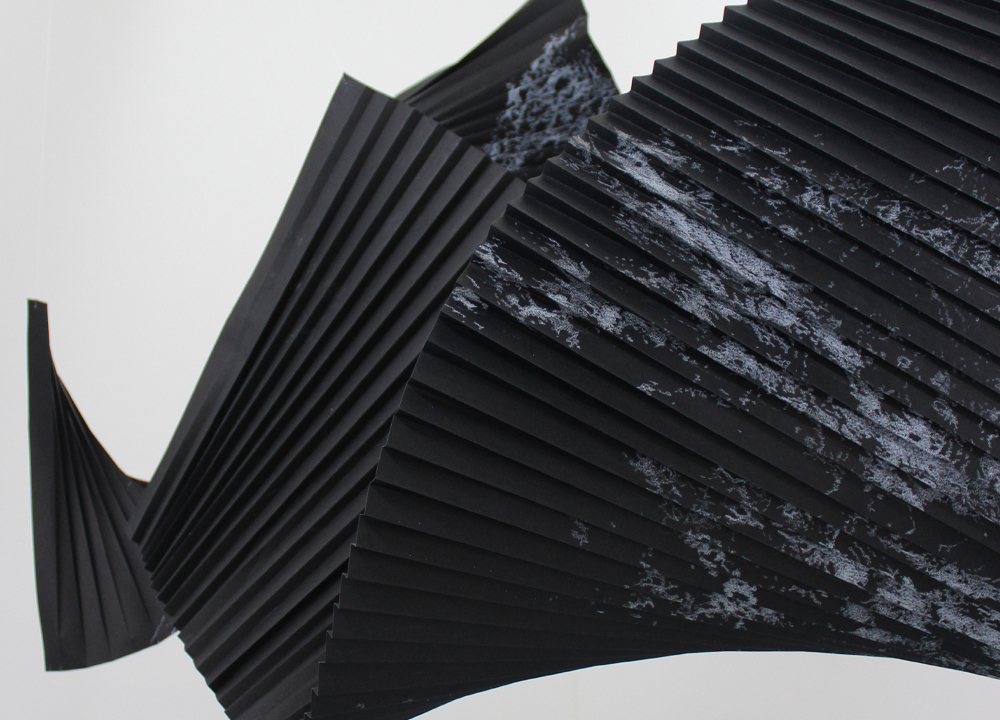 FOLDED FORCE consists of new experimental paper works, where large paper panels containing part hidden and disrupted drawings are folded to allow the paper and drawing to flow with new perspectives.